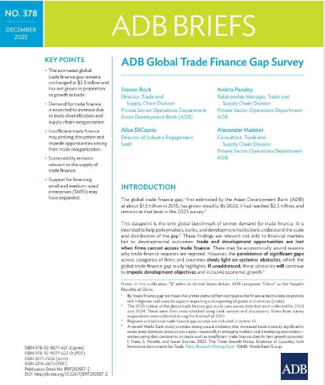 近日,亚洲开发银行(亚行)发布了最新一期的《全球贸易融资缺口调查》报告。80%的受访银行认为,随着企业推进市场多元化、深化区域内贸易并重构供应链,全球贸易融资需求预计将上升。