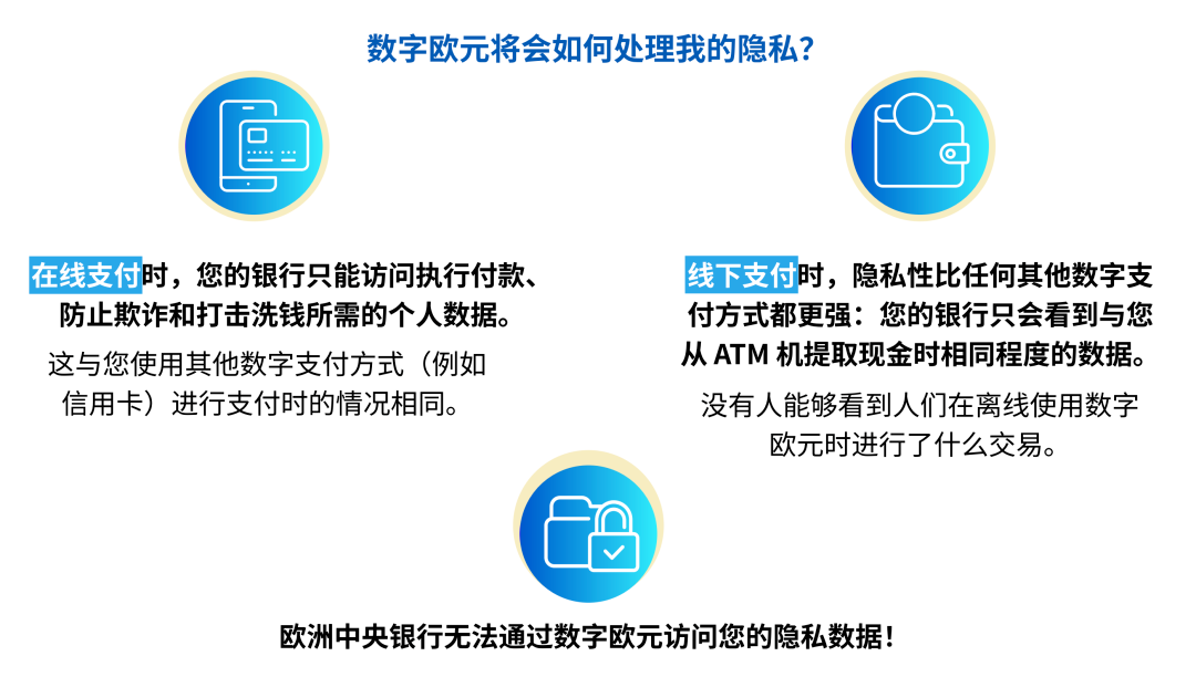 除了数字欧元可能带来的便利,它还能解决隐私问题。目前,私人发行者可利用人们个人数据进行商业用途,涉及稳定币和加密资产。然而,使用数字欧元进行消费,类似于使用从银行自动取款机提取的纸币。委员会在新闻发布会上表示,离线使用数字欧元支付时,不可观察交易行为。在新闻发布会上,委员会补充称:“欧洲各银行,如商业银行和欧洲央行,无法观测或追踪个人使用数字欧元进行交易的详细信息或数据。”
