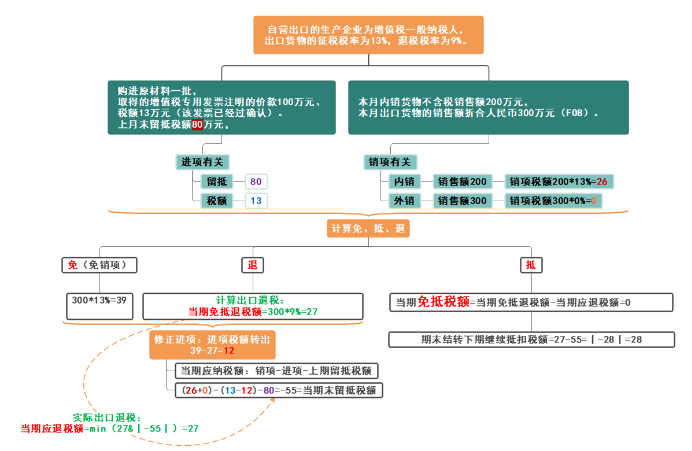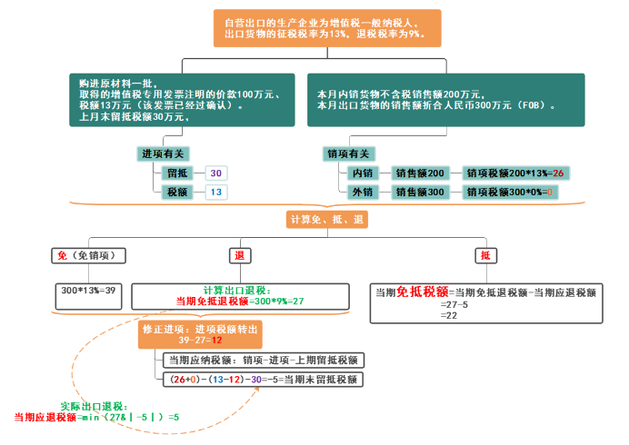 关于这个例子的逻辑图示,如下所示,你是否能自己也理顺呢:先把已知条件输入到下图的绿色部分,然后一步步分析免抵退: