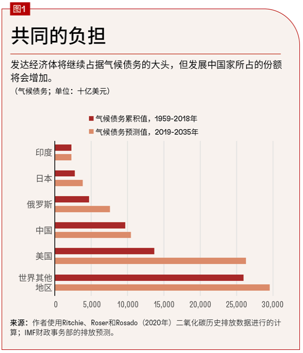 气候债务可根据实际和预测排放量以及碳的社会成本(每吨二氧化碳排放造成的经济损失)进行估算。估算结果表明,气候债务极其庞大,1959-2018年期间的气候债务已经达到约59万亿美元的水平(图1),预计2019-2035年期间将再增加80万亿美元。每个国家的气候债务规模既反映了其经济规模(与排放量呈正相关),也反映了其单位美元经济产出使用化石燃料(从而产生排放)的密集程度。能源用量的构成(例如大量使用煤炭)也会产生影响。截至2018年,气候债务的最大来源国依次为美国(14万亿美元)、中国(10万亿美元)和俄罗斯(5万亿美元)。从2018年开始,发展中经济体将在气候债务中占据更大份额,因为它们的经济增速相对较快。